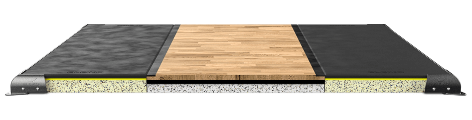 Sportivii efectueaza exercitiul cu bara pozitionata in centrul unei platforme din lemn, cu dimensiunea de 4 × 4
